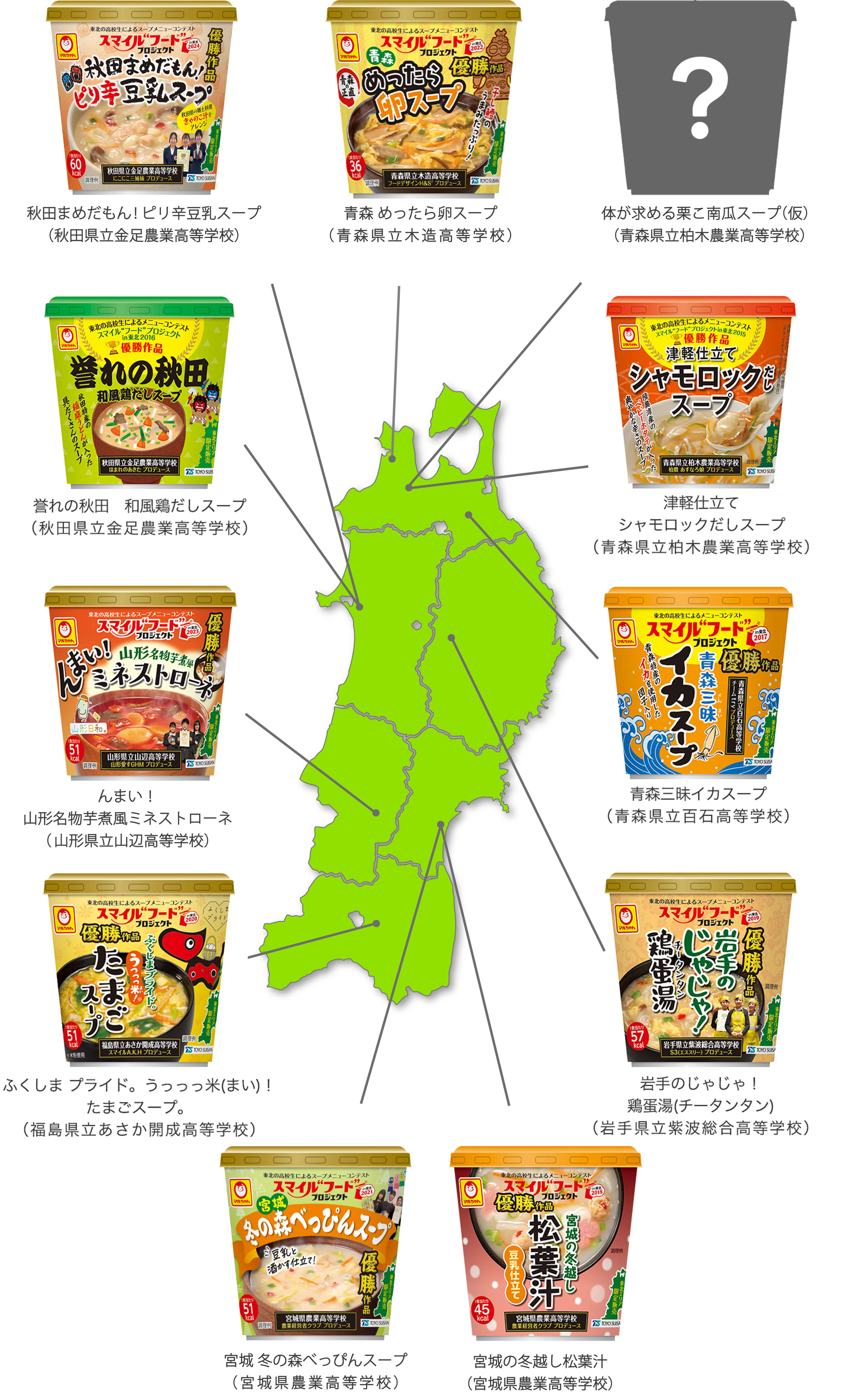 「スマイル“フード”プロジェクト in 東北」は、マルちゃんブランドでおなじみの東洋水産が主催する、「食」について興味・関心のある東北地区の高校生を対象とした「スープのレシピコンテスト」です。書類審査・決勝大会を経て優勝したチームの作品を、翌年にマルちゃんブランドで商品化する企画です。