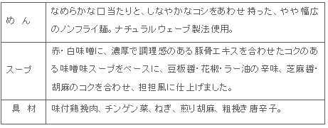 この度の『麺づくり』は、味噌ベースのスープに辛味を効かせた、体が温まる冬場にピッタリの担担麺です。ピリッとした辛味と胡麻のコクが絶妙のバランスで、なめらかな口当たりとしなやかなコシが特徴のノンフライ麺との相性も抜群の美味しさです。