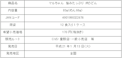 東洋水産株式会社(本社:東京、社長:堤 殷)では、カップ入り即席麺「マルちゃん 旨みたっぷり 肉うどん」を平成21年1月13日(火)より全国でリニューアル発売致します。
