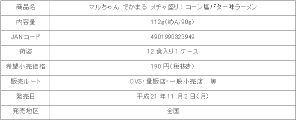 東洋水産株式会社(本社:東京、社長:堤 殷)では、カップ入り即席麺「マルちゃん でかまる メチャ盛り!コーン塩バター味ラーメン」を平成21年11月2日(月)より全国にて新発売致します。