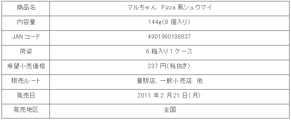 東洋水産株式会社(本社:東京、社長:堤 殷)では、チルドシュウマイ「マルちゃん Pizza風シュウマイ」を2011年2月21日(月)より全国にて新発売致します。