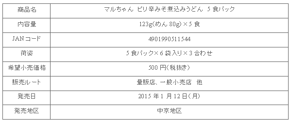 東洋水産株式会社(本社:東京、社長:今村 将也)では、即席袋麺「マルちゃん ピリ辛みそ煮込みうどん」を2015年1月12日(月)より、中京地区にて新発売致します。