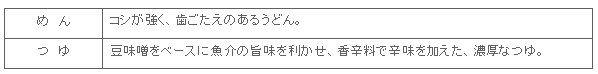 歯ごたえのあるうどんに、色が濃く旨味の強い豆味噌をベースにした濃厚なつゆが、よく絡みます。魚介だしと香辛料を利かせたこだわりの「ピリ辛」味で、食欲をそそる一品に仕上げました。