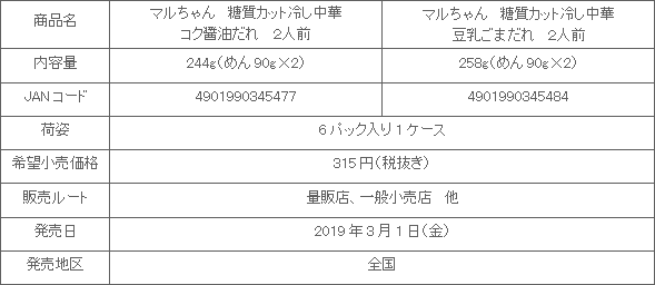 東洋水産株式会社(本社:東京、社長:今村 将也)では、チルド麺「マルちゃん 糖質カット冷し中華 コク醤油だれ 2人前」「同 豆乳ごまだれ 2人前」を2019年3月1日(金)より、全国にて新発売致します。