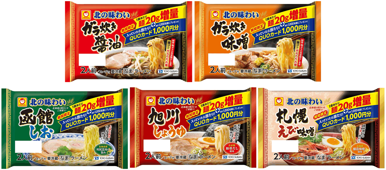 この度の企画は、「マルちゃん 北の味わい」シリーズを対象とし全品の麺を1食あたり20g増量するとともに、合計1,000名様に「マルちゃんオリジナルQUOカード(1,000円分)」が当たるキャンペーンです。キャンペーンロゴが印刷されている対象商品をご購入いただき、中にQUOカードが同封されていれば当たりとなります。