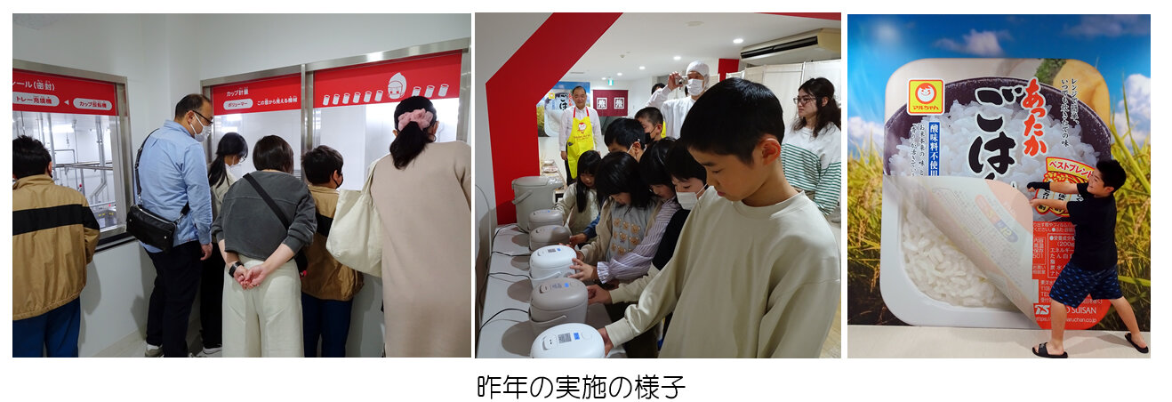 | 実施内容 | 各 回 共 通 | ・ "お米"の特徴や性質についての講義・実験 ・ オリジナル炊き込みご飯づくり・試食 ・ 見学通路から製造ラインの見学(記念撮影スポットあり) |
