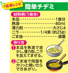 また、パッケージ側面には、スープとしてお召しあがりいただく以外の楽しみ方として、本品を使った応用レシピ「簡単チヂミ」を掲載しています。
