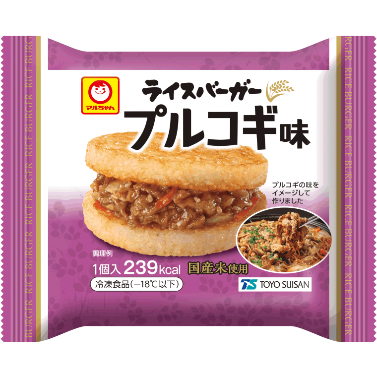 牛肉・玉ねぎ・にんじんを甘辛く味付けしたプルコギ味の具材を、こんがり焼いたごはんのバンズでサンド