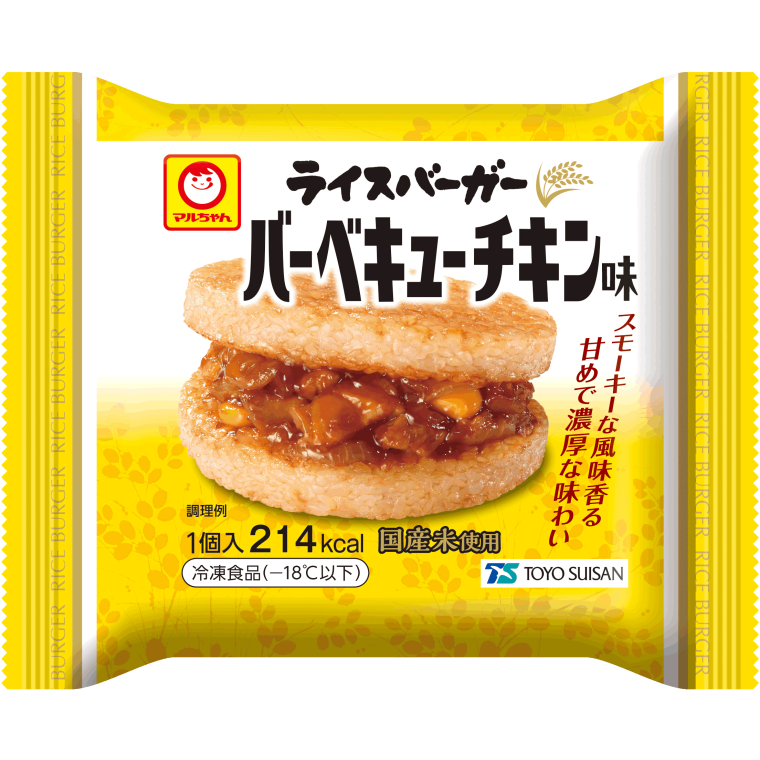 鶏肉・玉ねぎ・コーンをみんな大好きバーベキューソースに絡めて、こんがり焼いたライスパテでサンド。