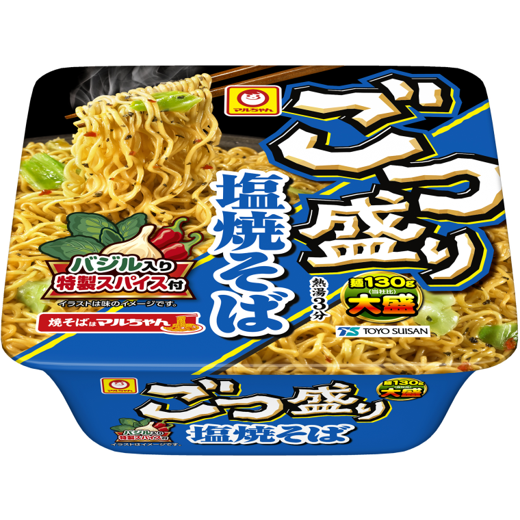 麺130g、チキンと玉ねぎの旨みが利いた塩味ソースに「バジル入り特製スパイス」が付いた大盛塩焼そば。