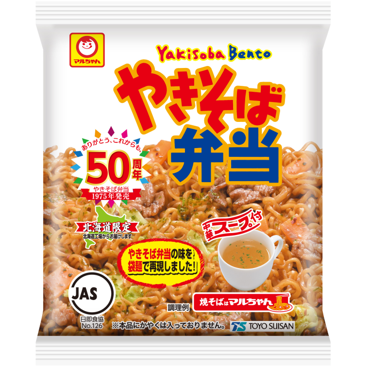 やきそば弁当50周年記念の限定袋麺!ちょっと甘めのソース味焼そば。ふりかけ・特製中華スープ付。