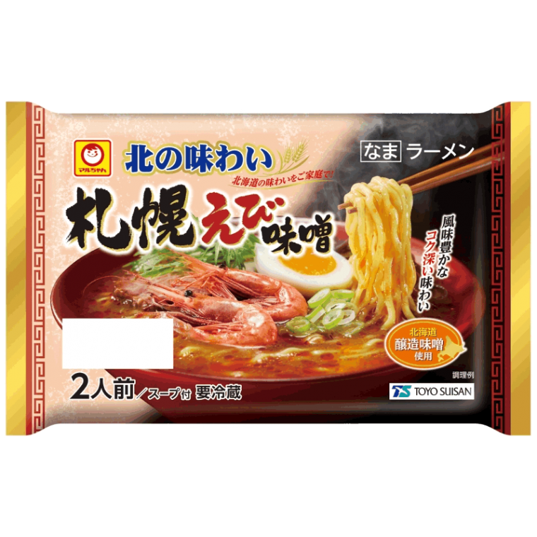 強いコシと弾力が特長の中太ちぢれ麺に、北海道醸造味噌のコクとえびの旨みがギュッと詰まったえび味噌スープを合わせました。
