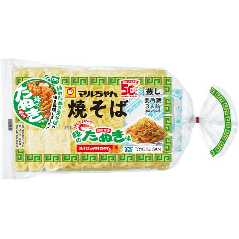 即席麺「緑のたぬき天そば」の味わいをチルド焼そばで再現しました。緑のたぬき天そばの鰹節と七味唐辛子を利かせた醤油味。干し小えび入り。