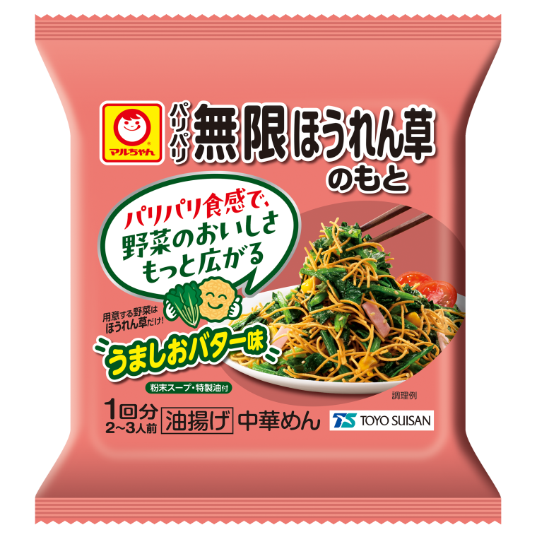 パリパリとした食感が特長の麺に、やみつきになるうましおバター味を合わせました。ほうれん草が驚くほどおいしくなる味わいです。